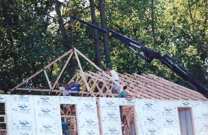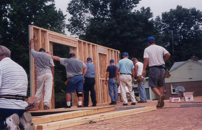 “We did four houses (during the 1998 blitz),” says Fran McCaffrey, who was the executive director during the majority of the Emerald Valley build. “That was fast. We had four companies volunteer their carpenters to get it started. At seven o’clock on Monday morning, they came in, and by noon the houses were framed. They were having a ball. They were they were challenging each other’s companies to see who could get it done fastest. Those boys were flying.”